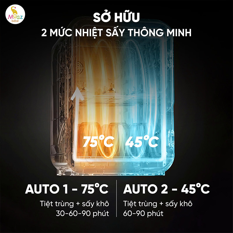 - Có thể lựa chọn chức năng Tự động 1 hoặc 2 tùy theo nhu cầu sấy khô trong bao nhiêu độ, phù hợp với những loại bình sữa khác nhau, với Auto 1 là sấy khô ở 75 độ C và Auto 2 và sấy khô ở 45 độ C.