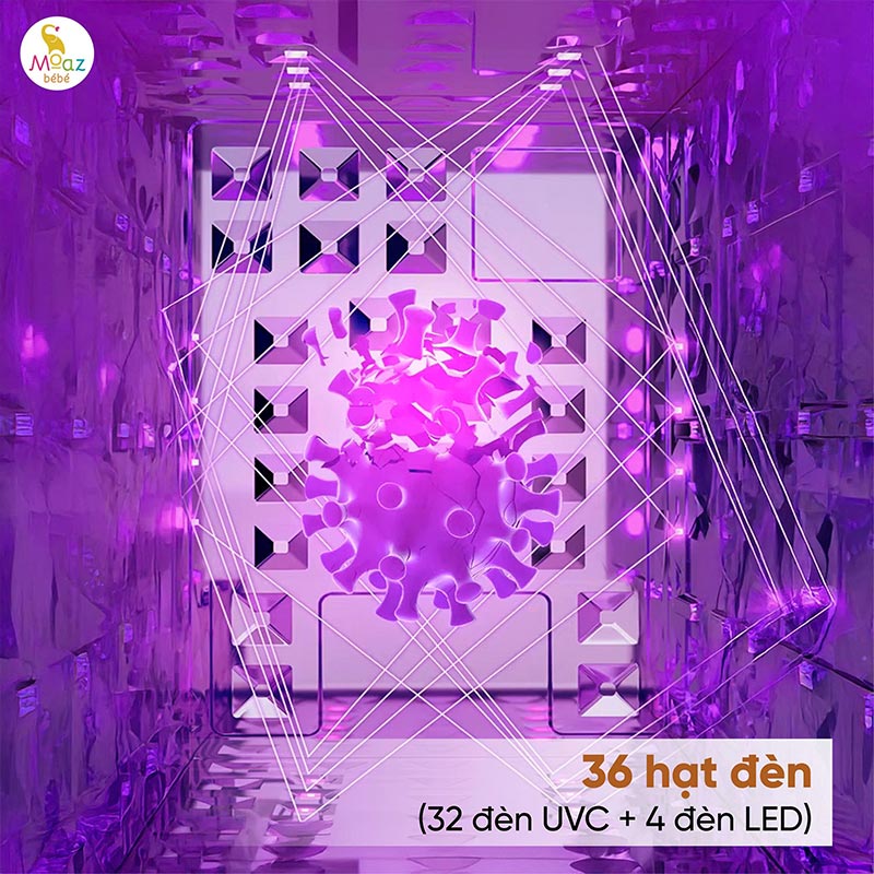 - 36 hạt đèn UVC phân bố đều tại 6 mặt bên trong của máy, loại bỏ những vi khuẩn trong từng ngóc ngách bình sữa của bé.